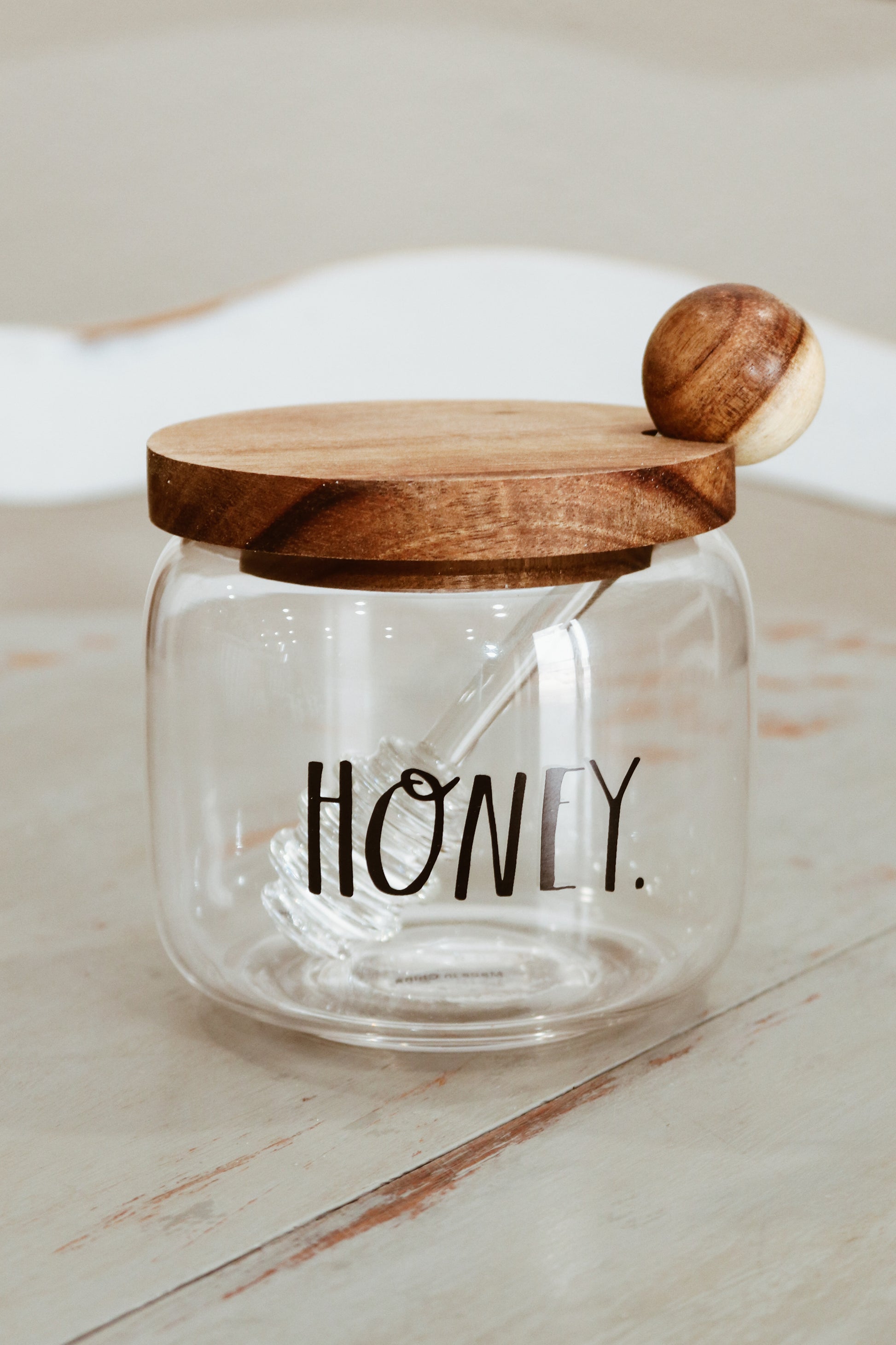 Rae Dunn glass honey pot.